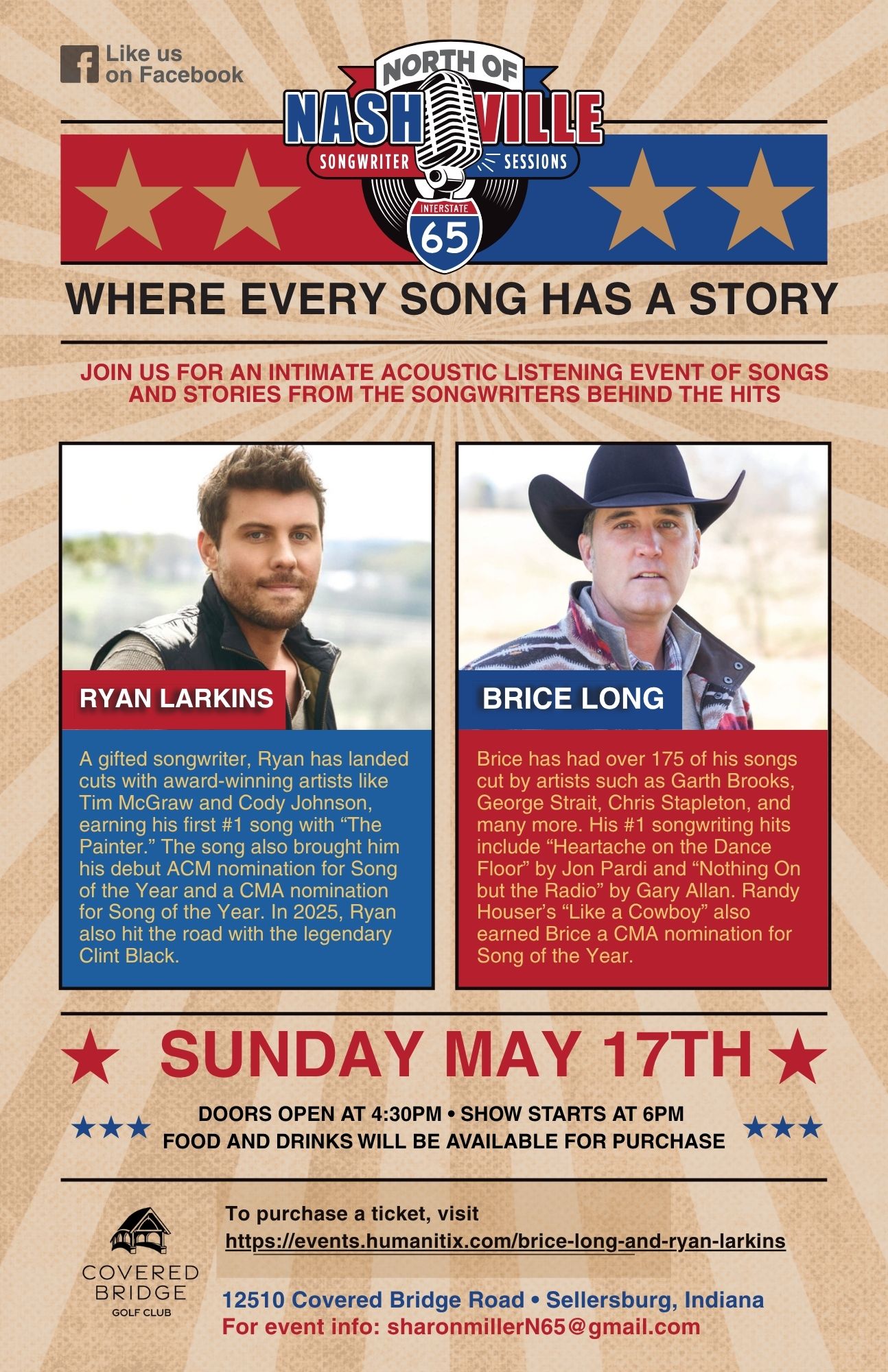 Join us for North of Nashville Songwriter Sessions, an intimate acoustic evening where every song has a story. Enjoy a one-of-a-kind live experience featuring hit songwriters Ryan Larkins and Brice Long as they perform and share the stories behind songs recorded by artists like Tim McGraw, Garth Brooks and more. The doors opening at 4:30 […]
