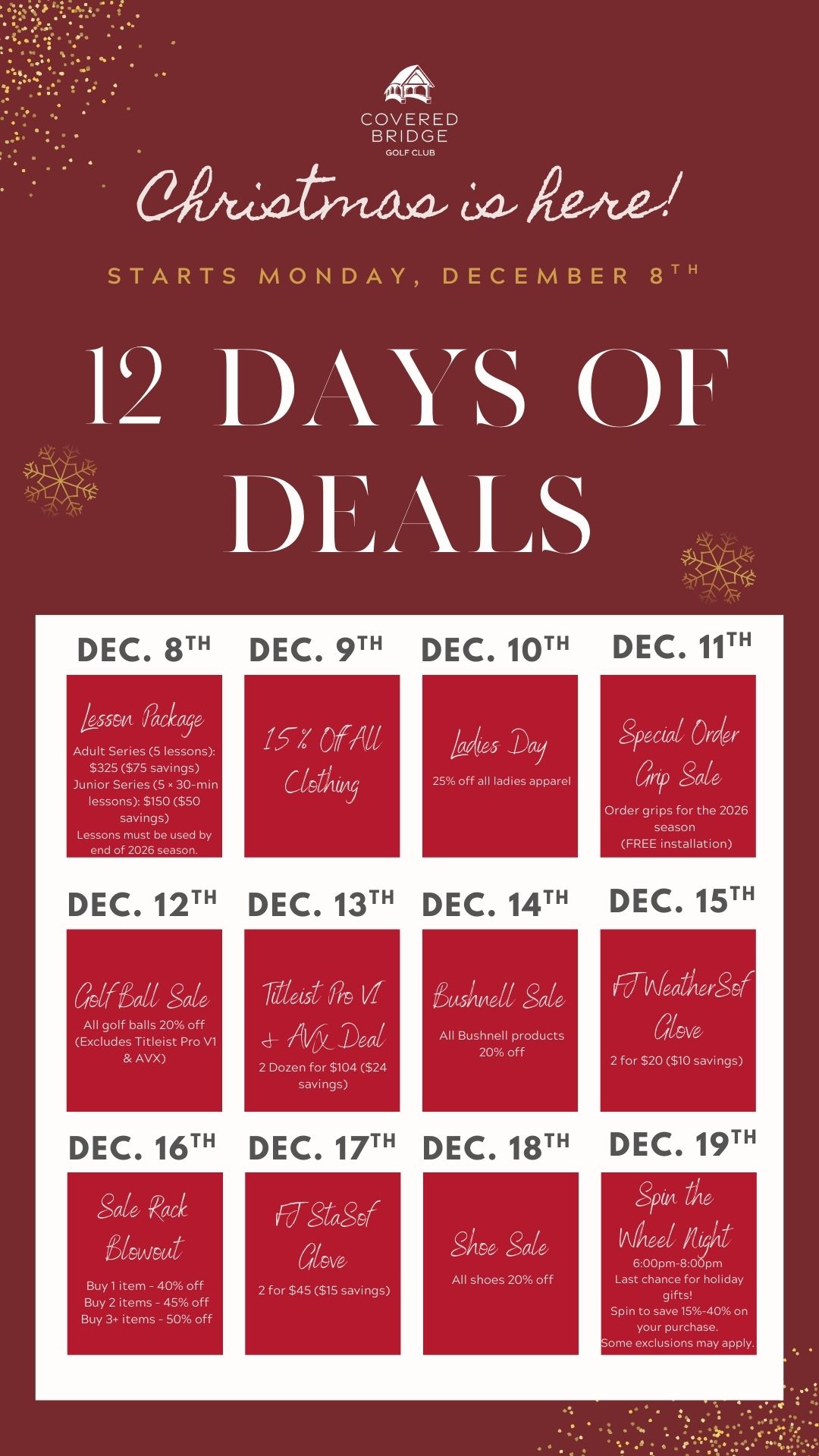 Kick off the holiday season with 12 Days of Deals at the Covered Bridge Golf Shop! Enjoy daily specials on apparel, equipment, accessories, and more. From lesson packages and golf balls to Bushnell products, Titleist Pro V1 deals, glove specials, and a blowout sale rack, there’s something for every golfer on your list. See the full daily breakdown below and don’t miss a single deal.